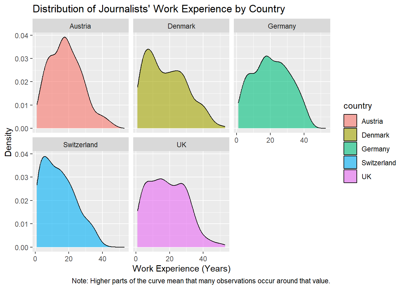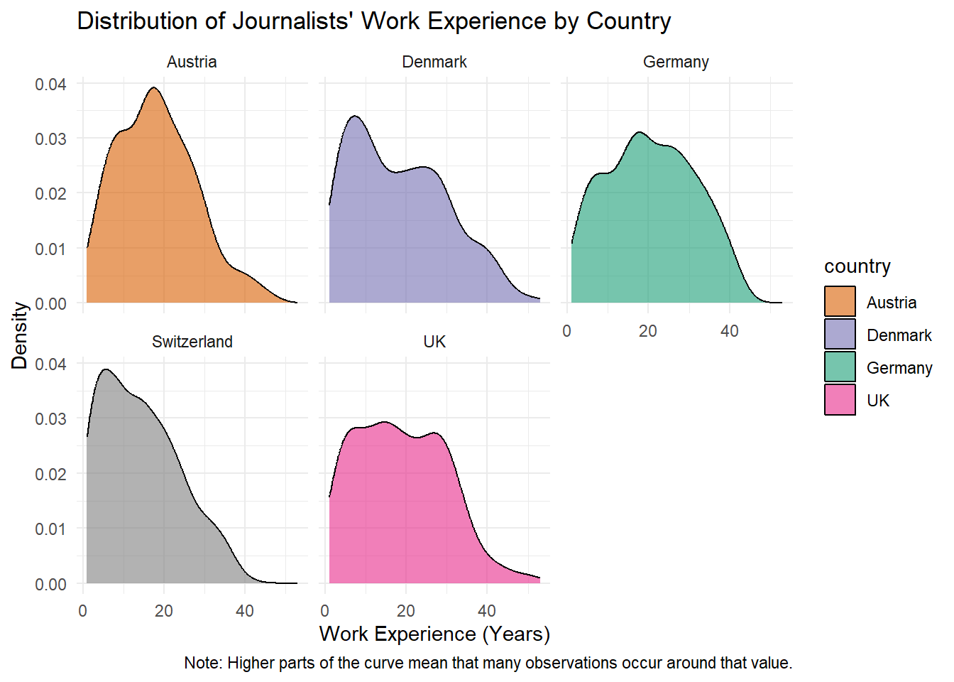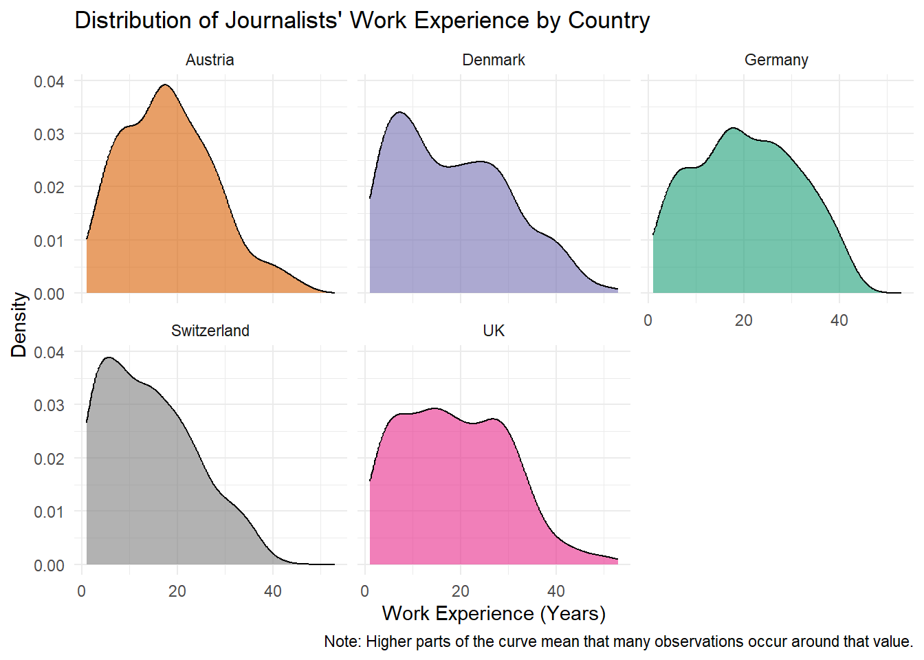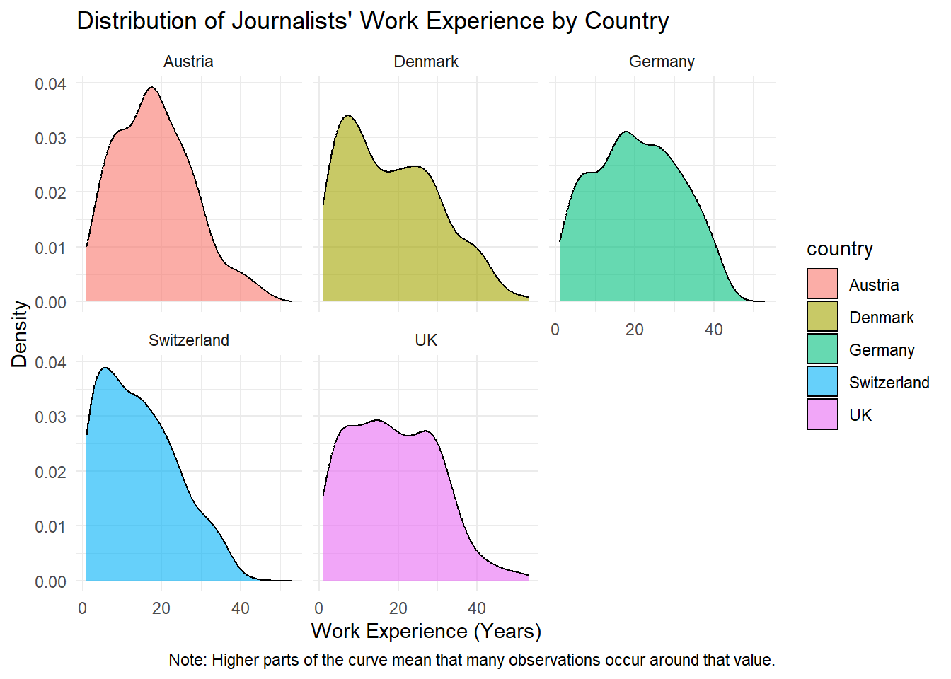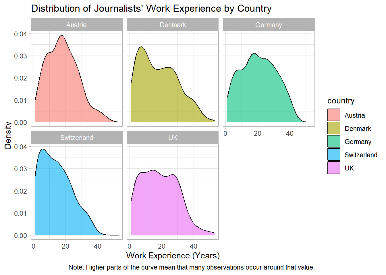 This makes it easier to compare the distributions of journalists’ work experience across countries, as each country is displayed in its own subplot.