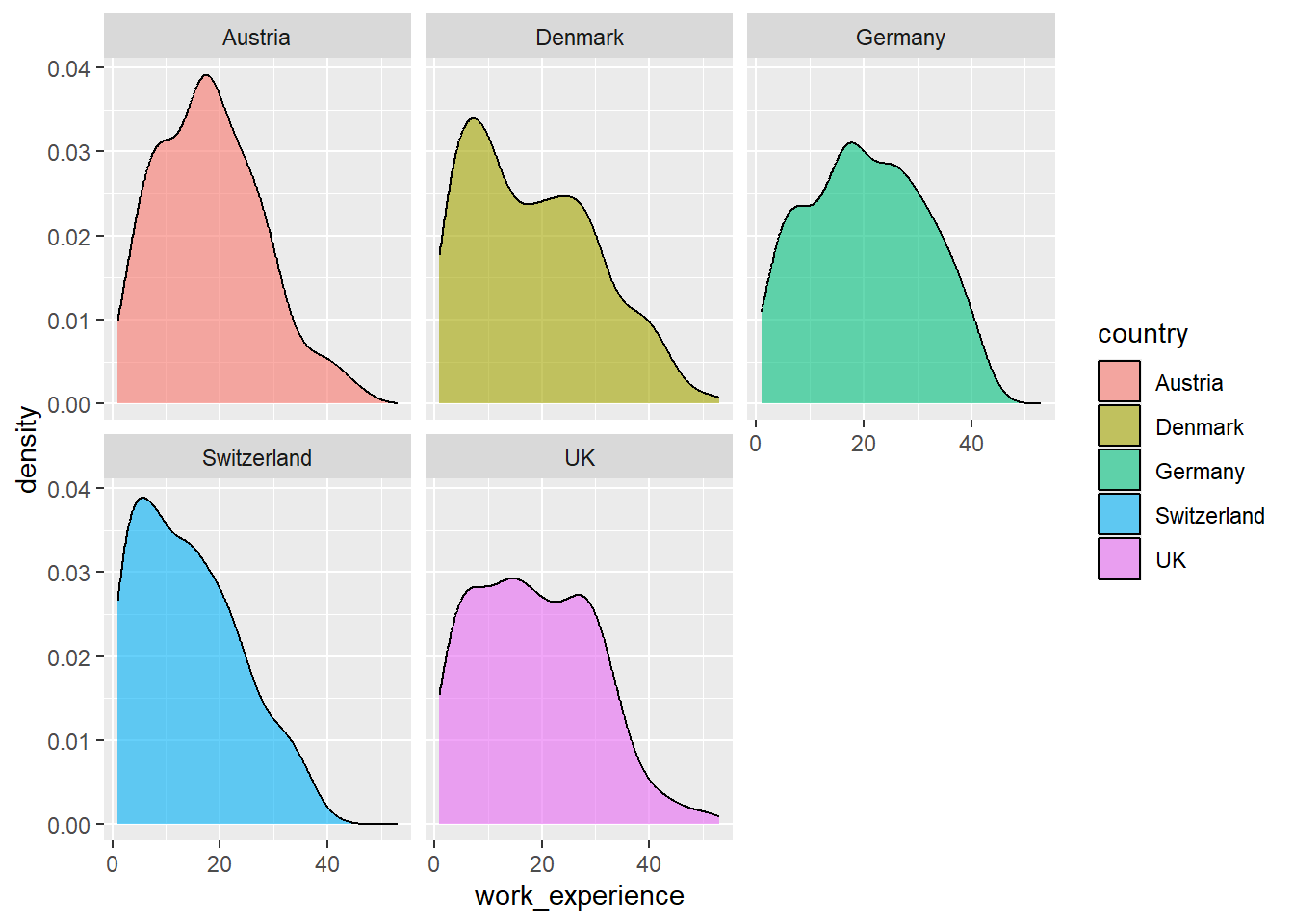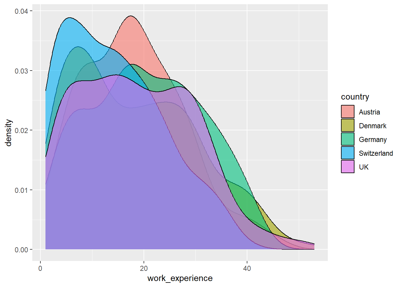 In short, this function plots a density estimate, that is, a smoothed representation of the distribution of a numeric variable. In our case, it helps us see where values of work_experience are concentrated and how the distribution differs across countries.