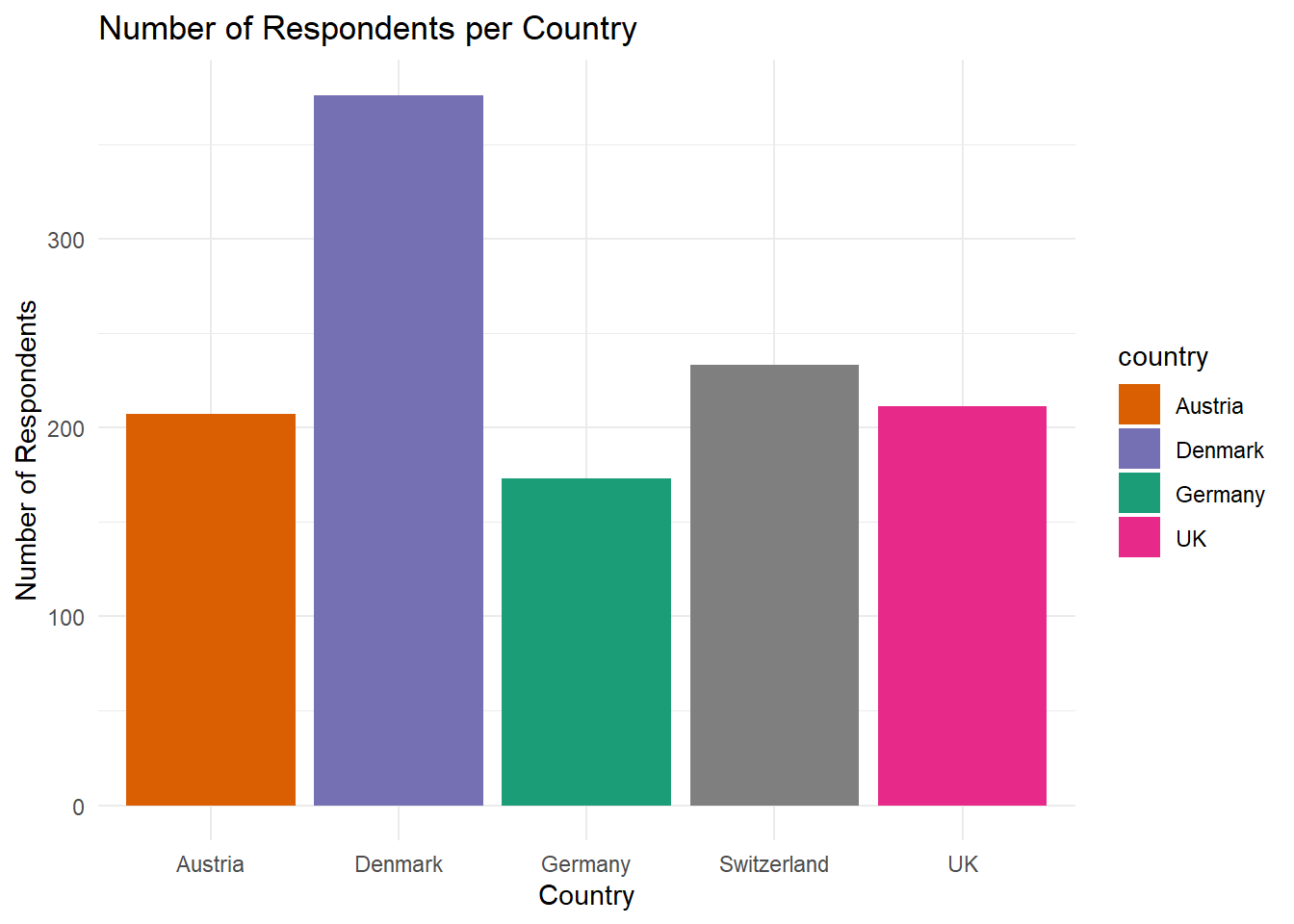 From scratch: Create a bar plot that plots the number of respondents per country. It should look like this: