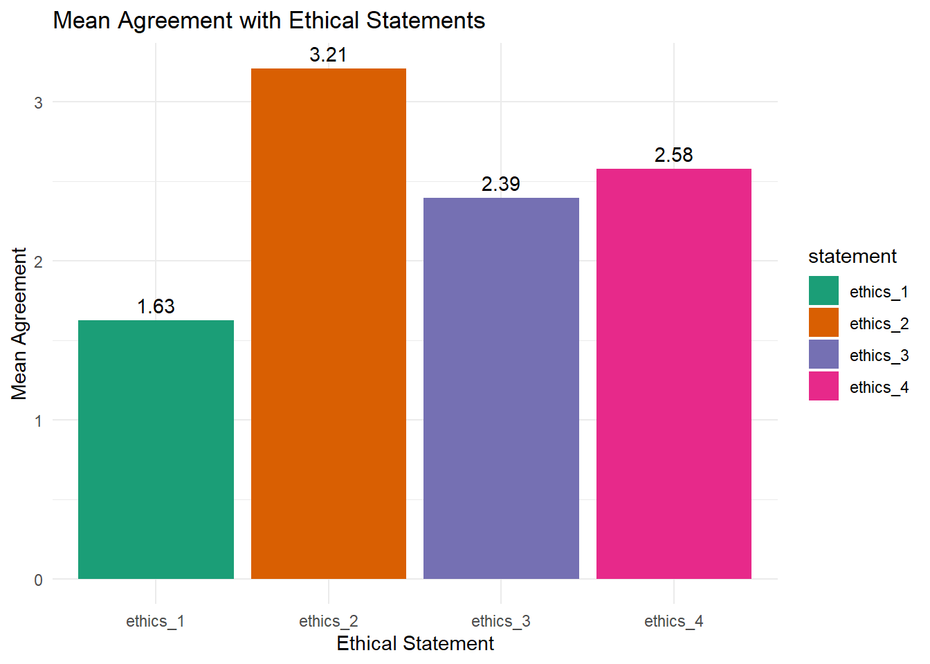 From scratch: Create a bar plot that plots average agreement to ethical statements (ethics_1, ethics_2, ethics_3, ethics_4). Add the mean agreement for each statement on top of each bar.
