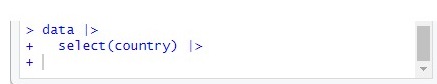select(country) |>… my computer does not react anymore. It seems that the code is running forever. My console also seems weird as it still shows the code and not an error: